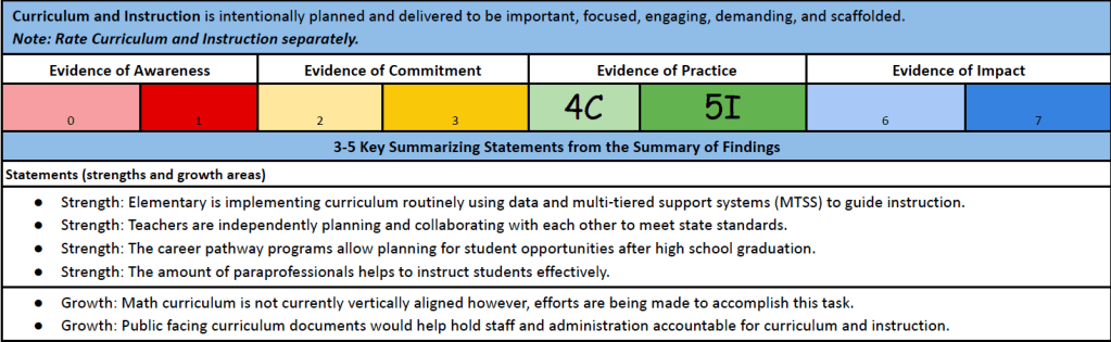 | Elementary is implementing curriculum routinely using data and multi-tiered support systems (MTSS) to guide instruction. | Math curriculum is not currently vertically alighted; however, efforts are being made to accomplish this task. |